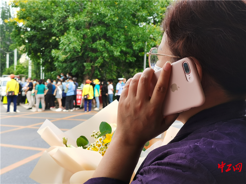 图为手捧花束的家长在北京市昌平区前锋学校中学部考点外迎接考生。 中工网 王妍 摄