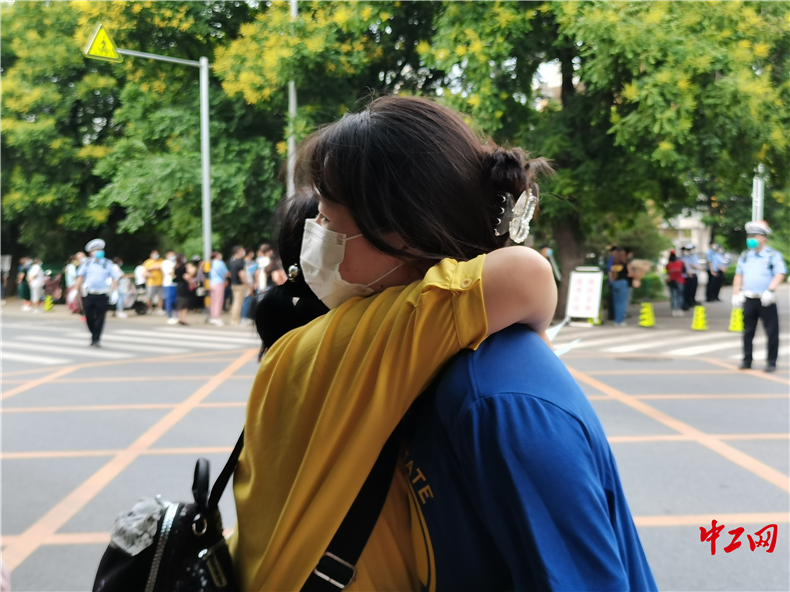 图为完成2022年高考的北京考生与家长拥抱。 中工网 王妍 摄