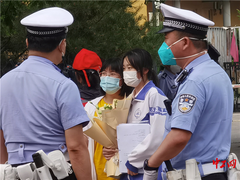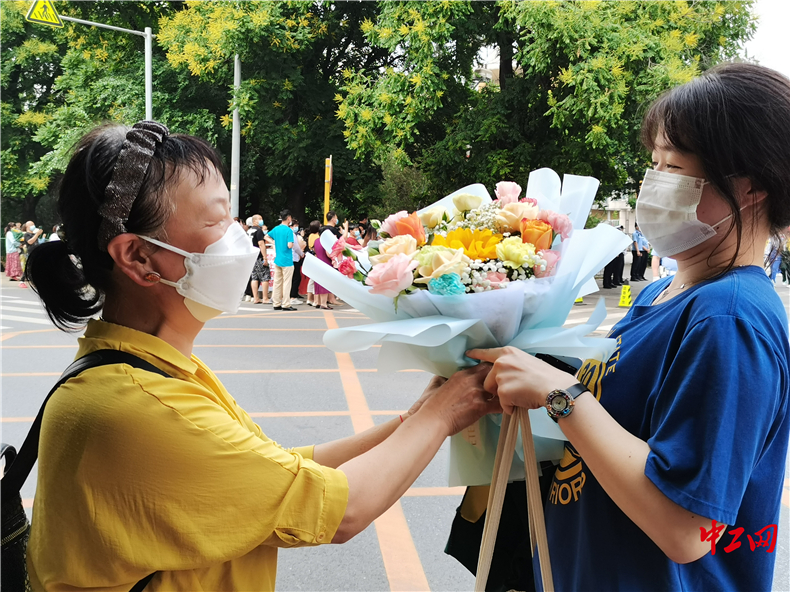 高考结束,家长为孩子送上鲜花。 中工网 王妍 摄