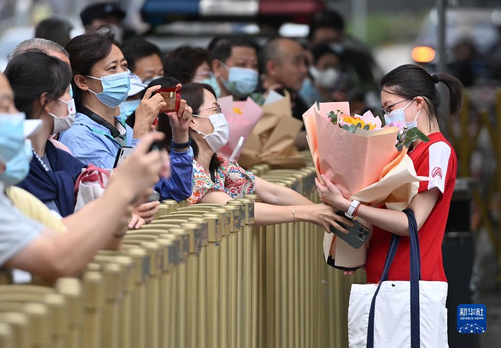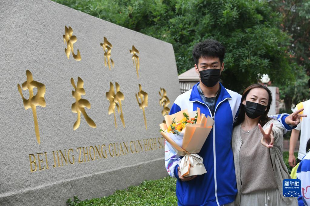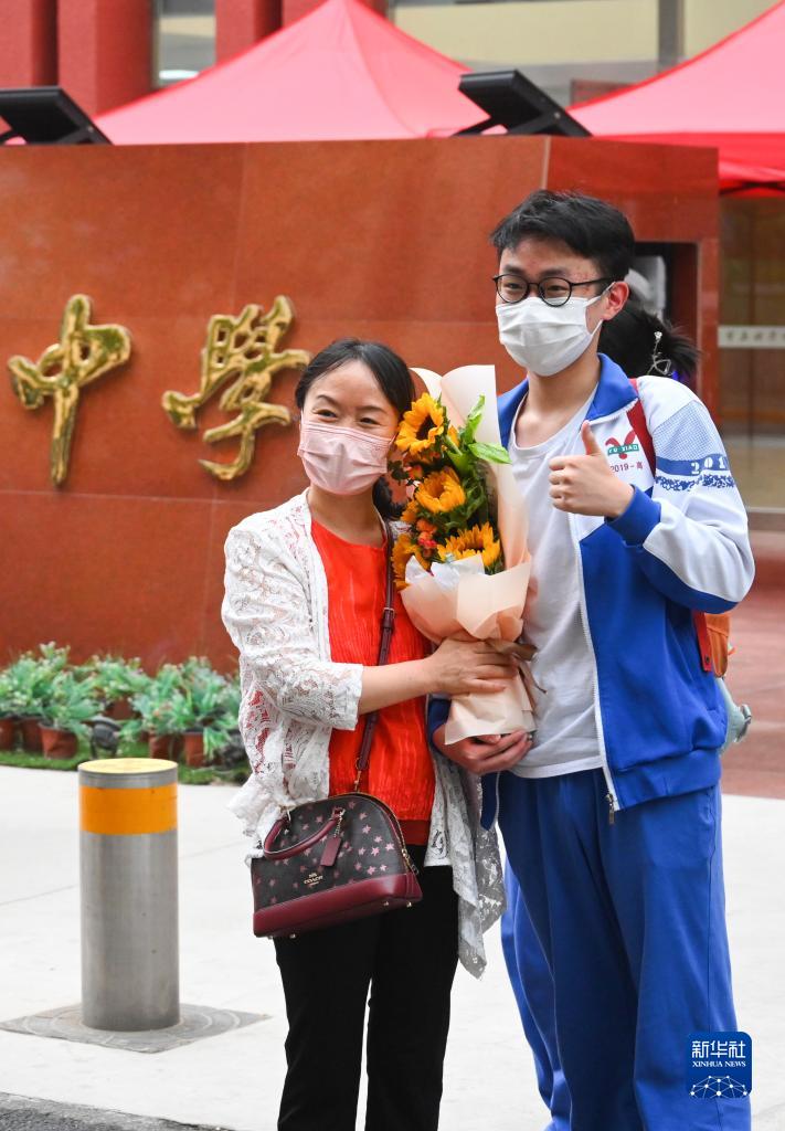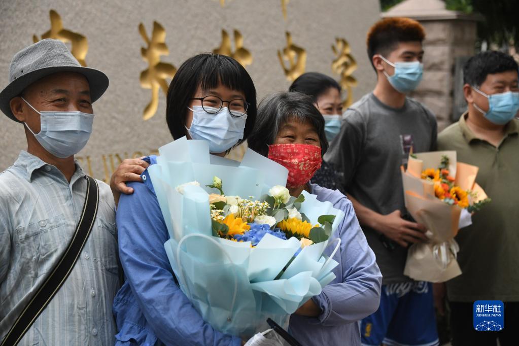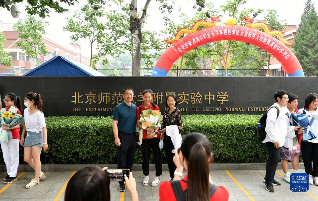 6月10日,在北京师范大学附属实验中学考点门口,考生家长为走出考点的考生送上鲜花。