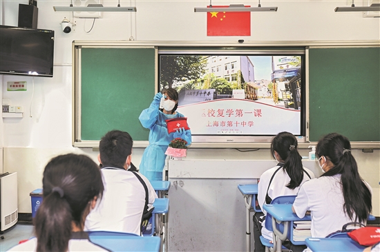 6月6日,全国高考前一日,上海市的高三复课,第十中学卫生老师在开学第一课上讲解防疫包使用规范。受疫情影响,上海市的高考将在7月7日~9日举行。