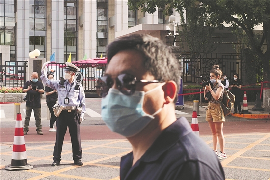 6月7日上午,北京市东直门中学考点,一位交警正在维持秩序,有记者(右一)把镜头对向了他。