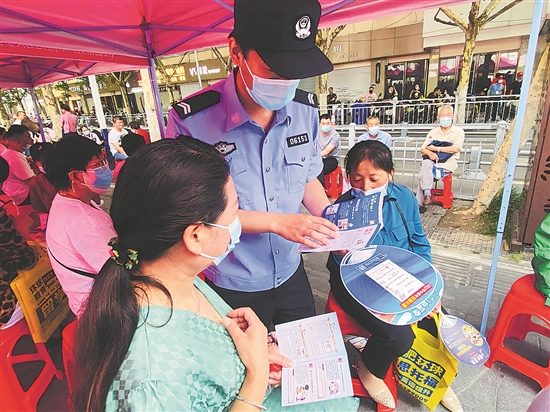 6月7日,在安徽合肥九中考点的考生家长候考区,合肥市公安局庐阳分局民警现场发放反诈宣传册,提醒家长谨防高考期间的诈骗陷阱。