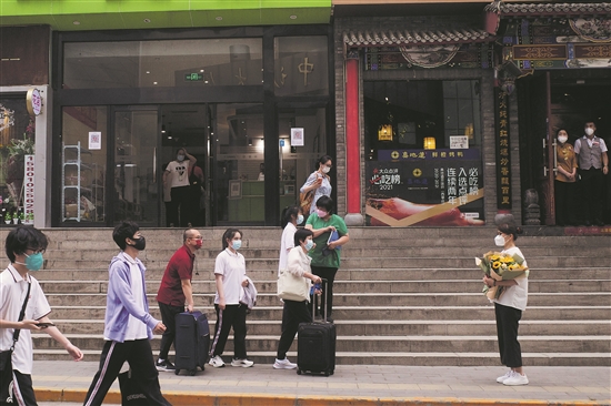 6月9日,北京市一处考点旁的宾馆门口,已经结束考试的学生和家长推着行李回家,另一名家长则捧着鲜花在等待孩子。