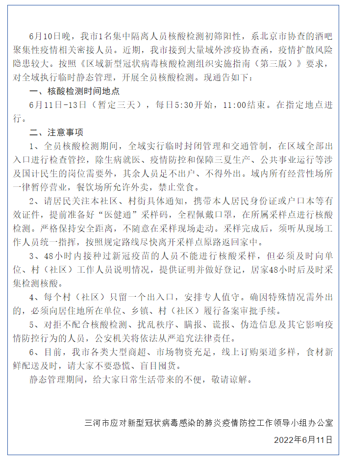 6月11日,河北三河市应对新型冠状病毒感染的肺炎疫情防控工作领导小组办公室发布通告:6月10日晚,河北三河市1名集中隔离人员核酸检测初筛阳性,系北京市协查的酒吧聚集性疫情相关密接人员。近期,河北三河市接到大量域外涉疫协查函,疫情扩散风险隐患较大。按照《区域新型冠状病毒核酸检测组织实施指南(第三版)》要求,对全域执行临时静态管理,开展全员核酸检测。