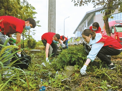 志愿者在西河工业区附近进行环境卫生整治。(韩林雍 沈孙晖 摄)