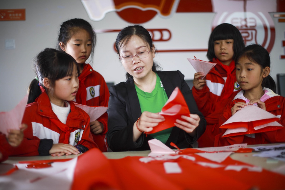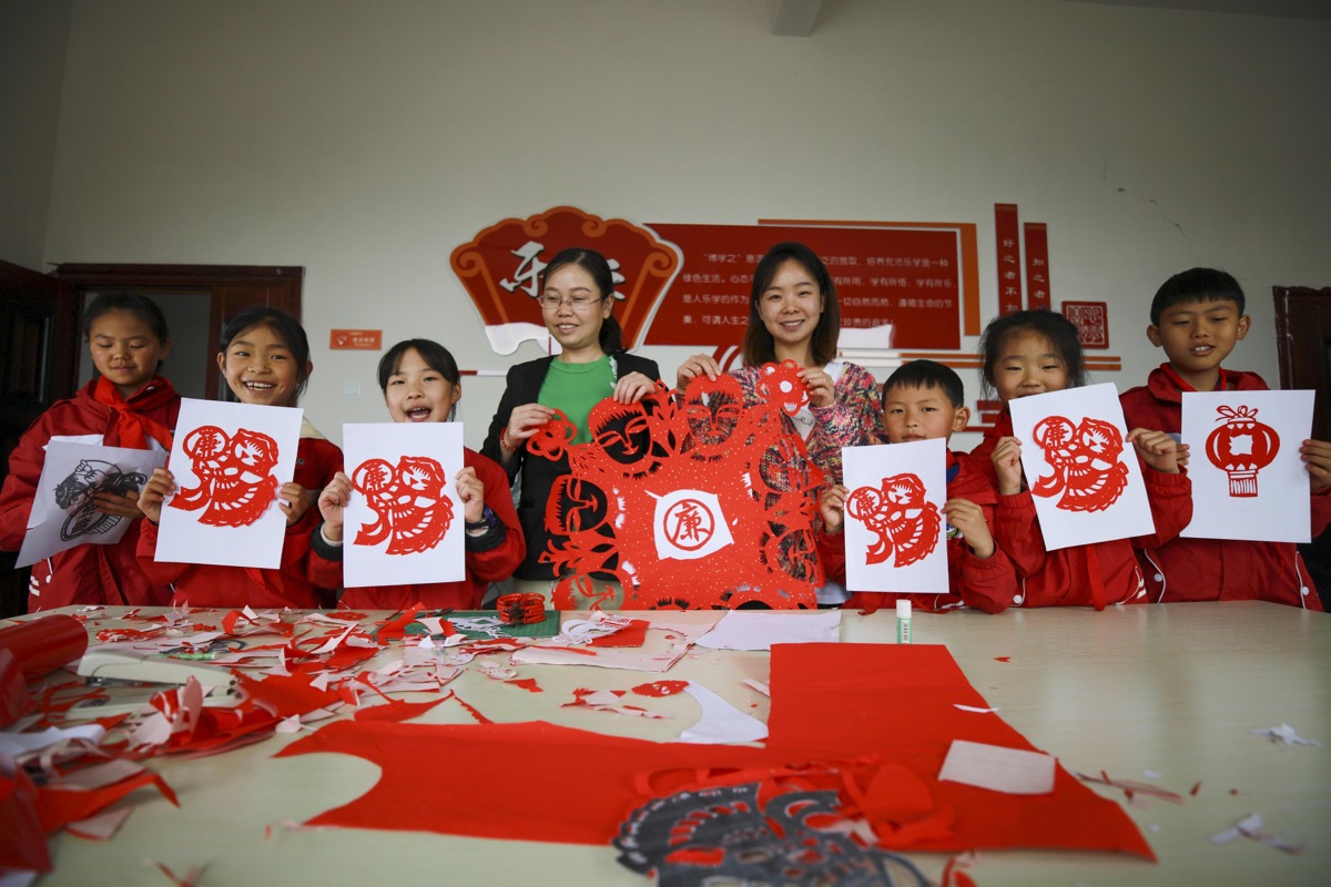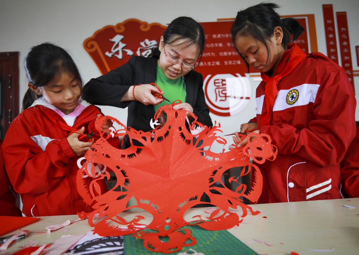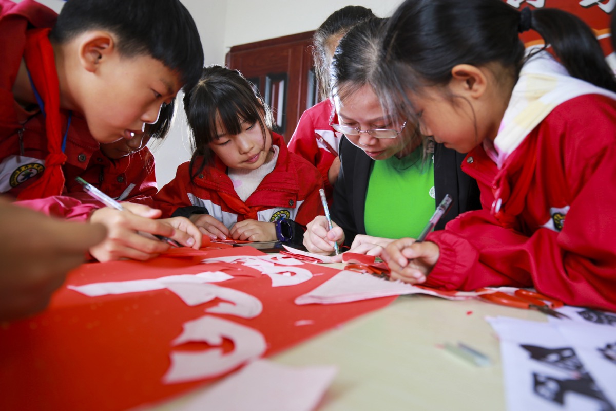 6月13日,剪纸艺人(右二)在贵州省黔西市雨朵镇雨化小学指导小学生创作廉政剪纸作品。