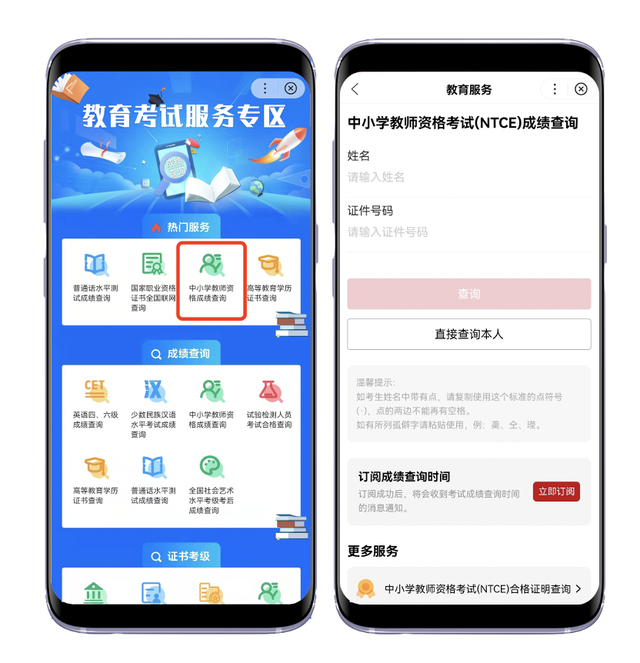 点击下方卡片直达“教育考试服务专区”,找到中小学教师资格考试成绩查询服务。