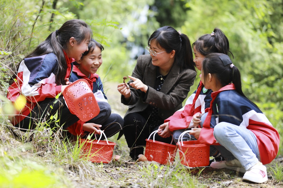 6月14日,生物教师(中)在贵州省黔西市甘棠镇毕架村小树林内给小学生讲解食用菌和毒菌的区别。