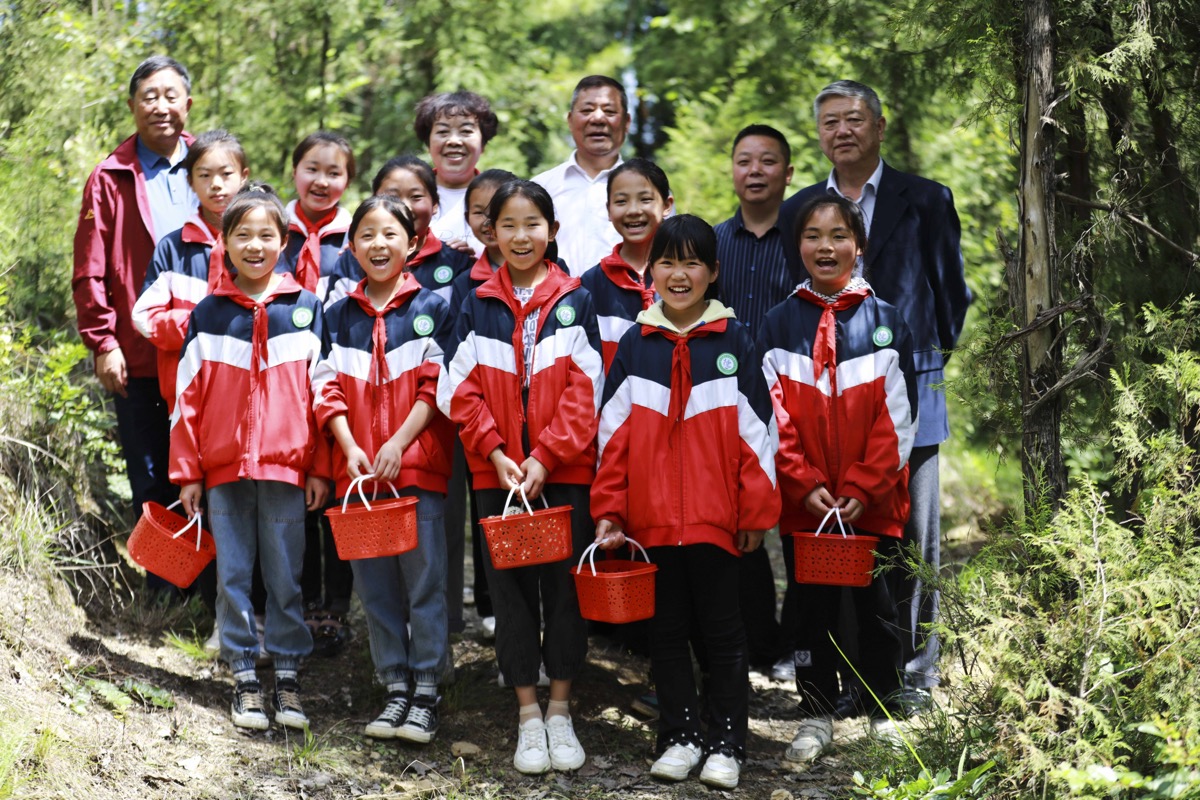 6月14日,关工委老同志和小学生在贵州省黔西市甘棠镇毕架村小树林内自然课的课后留影。