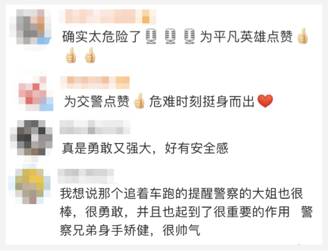这飞身一跃,网友纷纷竖起大拇指:“危难时刻挺身而出,你义无反顾的样子真帅!”“追着车跑的提醒警察的大姐也很棒”……