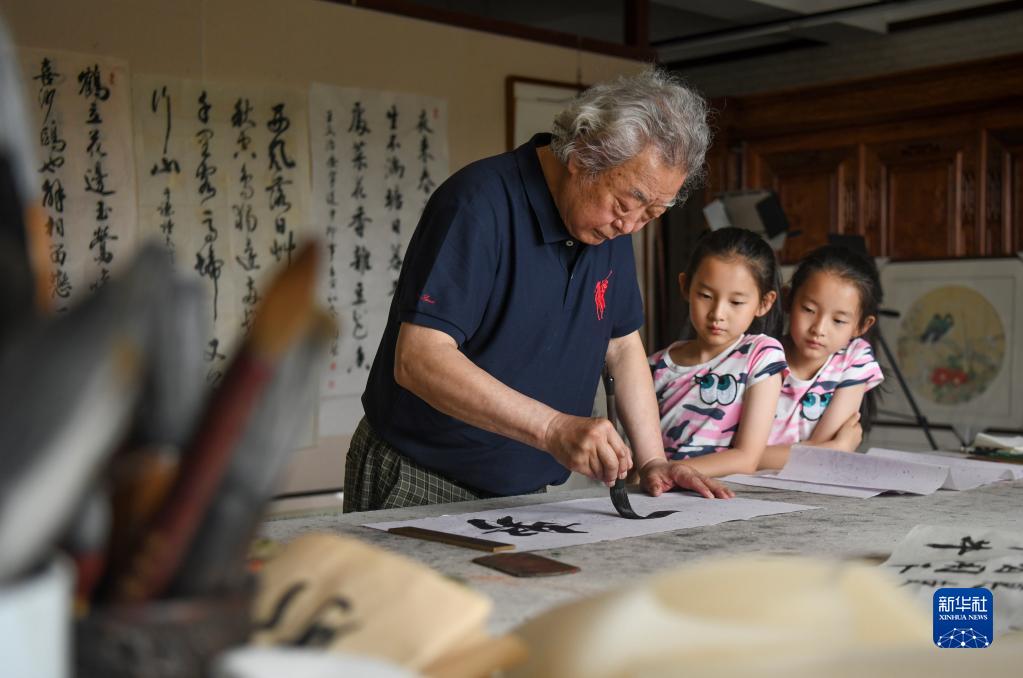 在位于乌鲁木齐市的陶然书法展示厅内,来自新疆教育学院实验小学的梁子萱(中)、梁子茉在欣赏书法家陶然(左)写作书法作品(6月16日摄)。