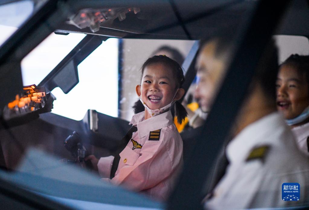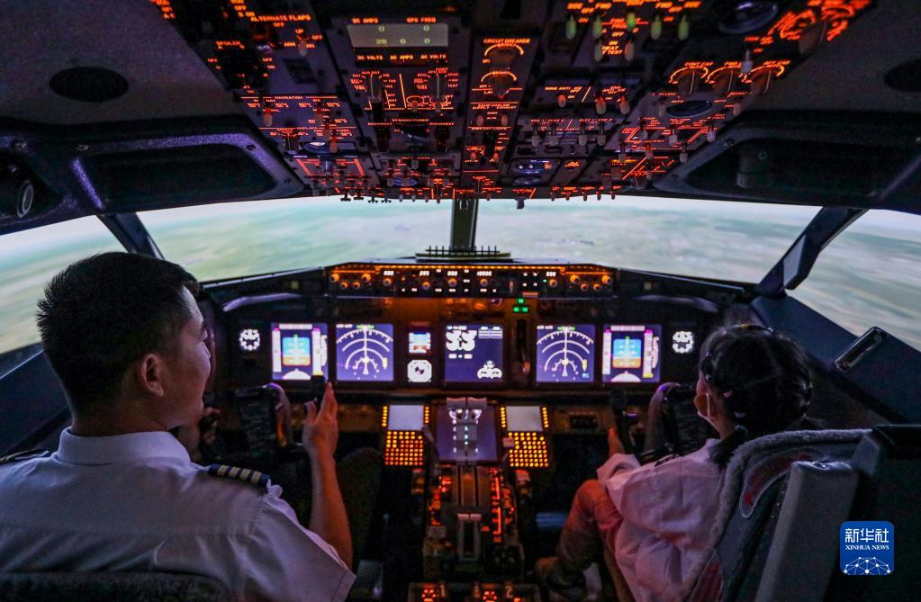 6月19日,在南航新疆基地,来自乌鲁木齐市金太阳幼儿园的刘灼曦(右)在飞行教员的指导下,体验双座737IPT程序模拟机飞行。