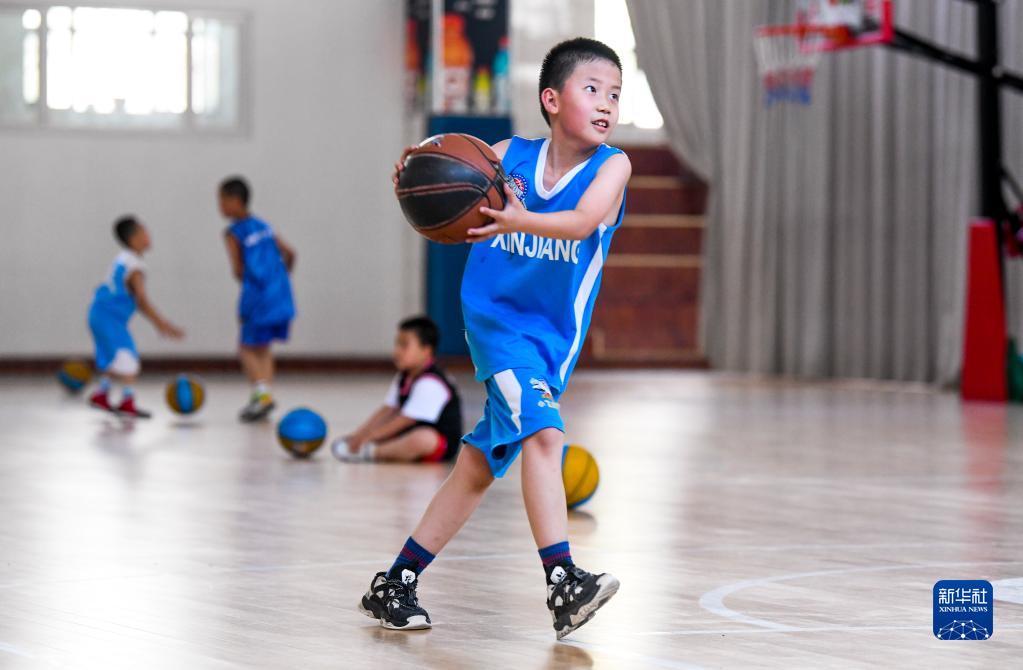 6月18日,在新疆广汇小飞虎篮球训练营内,来自乌鲁木齐市第十三小学一年级5班的于淼翰轩在练习打篮球。