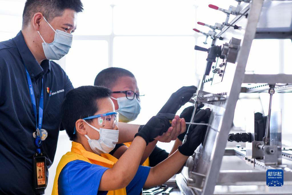 6月19日,在南航新疆基地,来自乌鲁木齐市第八十小学四年级11班的王梓轩(中)在教员袁鹏辉(左)的指导下,体验“修飞机”。