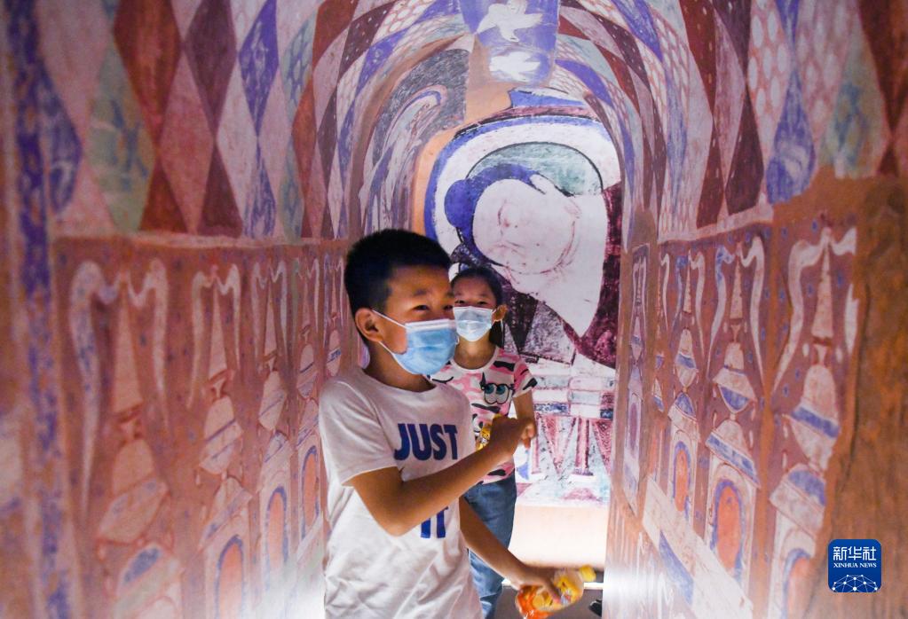 在新疆博物馆内,来自新疆教育学院实验小学二年级1班的郑开心(前)在复原的克孜尔石窟内参观(6月16日摄)。