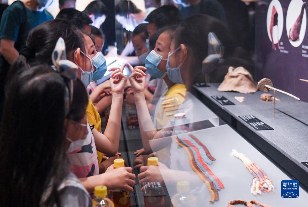 在新疆博物馆内,几名小朋友在参观展出的文物(6月16日摄)。