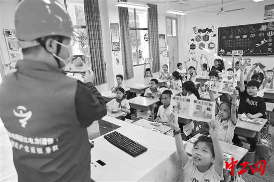 暑假来临之际,浙江省诸暨市总工会组织志愿者走进校园,用多种形式为中小学生送上安全培训。图为6月16日,国家电网浙江电力(诸暨)红船共产党员服务队的志愿者前往山下湖镇中心学校,为小学生讲解安全用电知识。 章奇斌 摄
