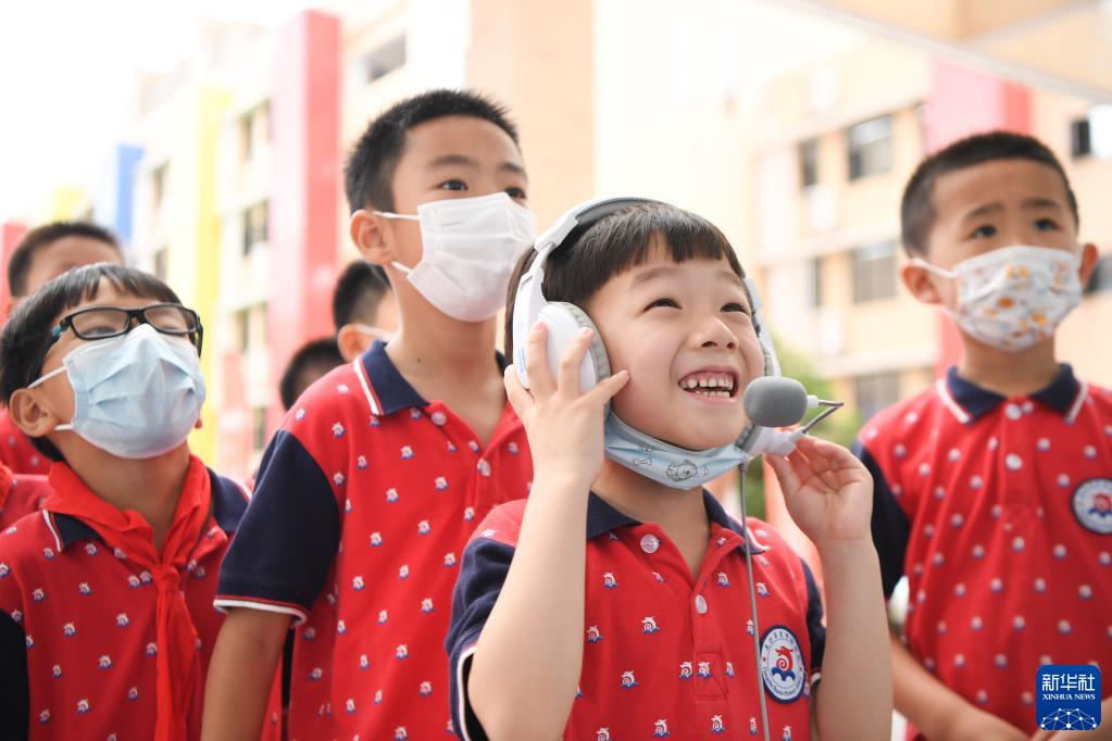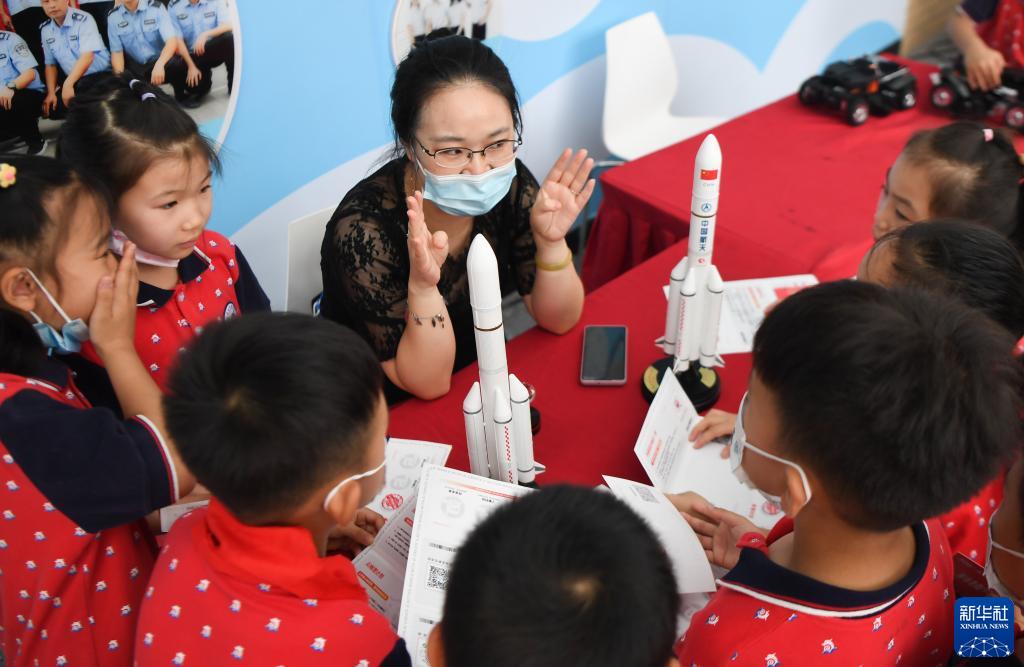 6月22日,老师(中)在长沙华夏实验学校给学生们讲授航天科普知识。