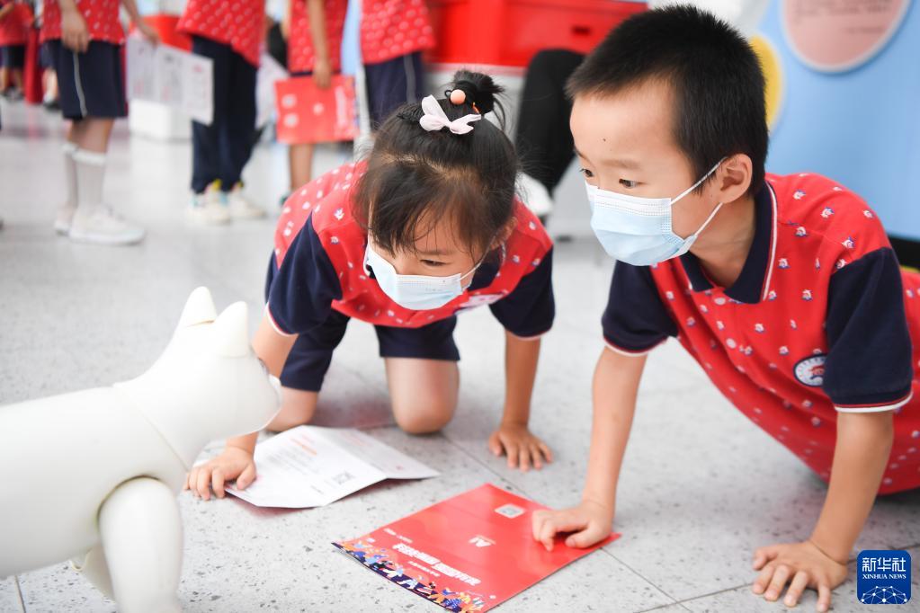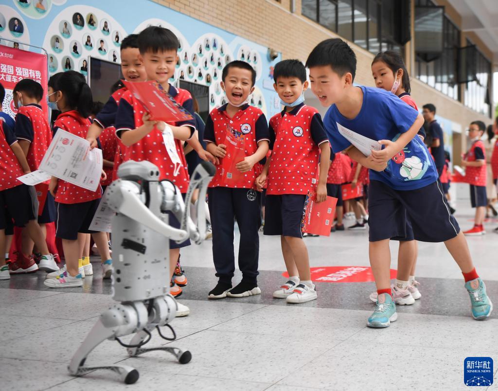 6月22日,学生们在长沙华夏实验学校和机器狗互动。