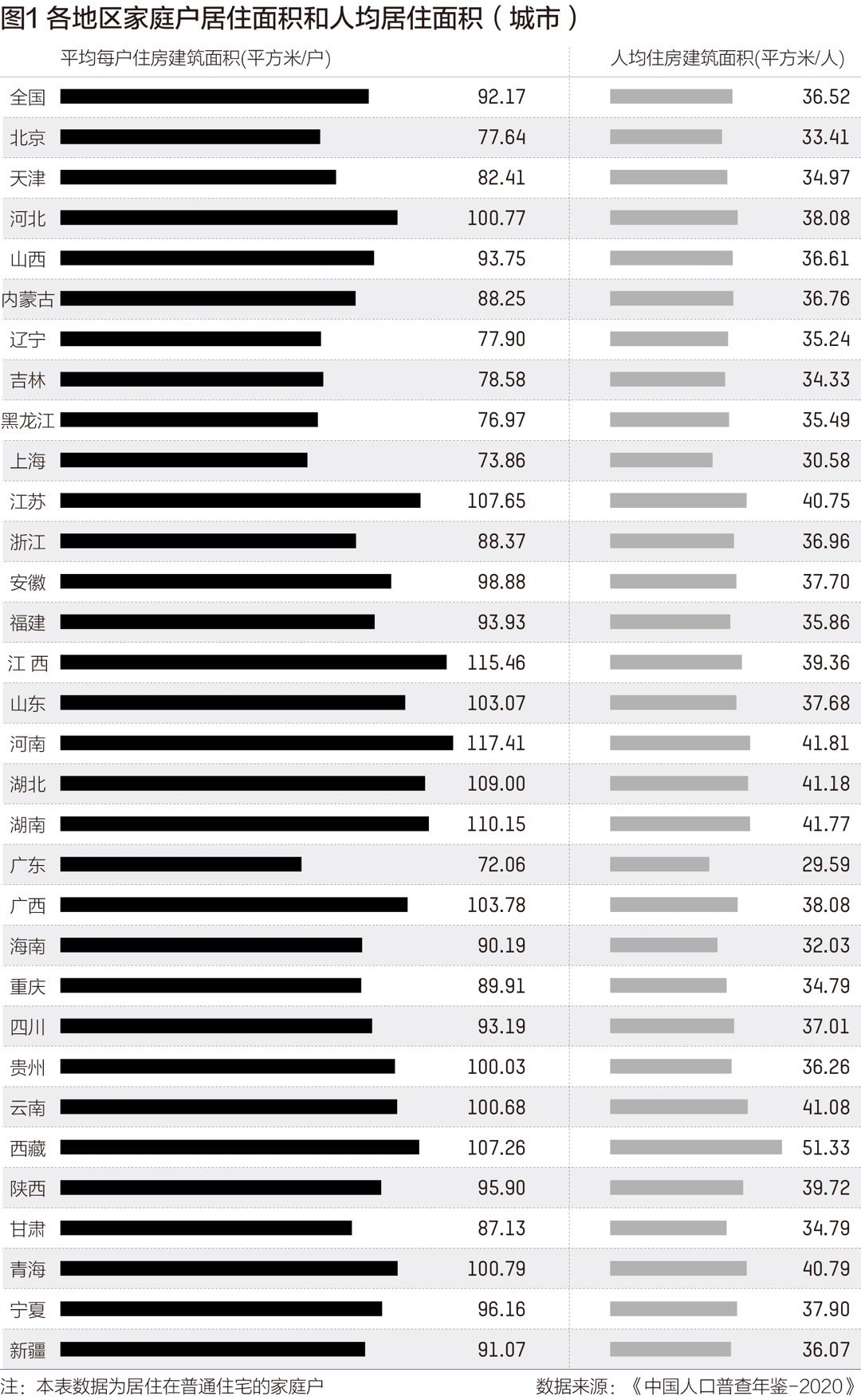 由于各个地区家庭结构的差异,户均人数也存在较大差异。因此,各地的城市人均居住面积数据更能直接反映各地居民的居住情况。数据显示,2020年我国城市人均住房建筑面积为36.52平方米。