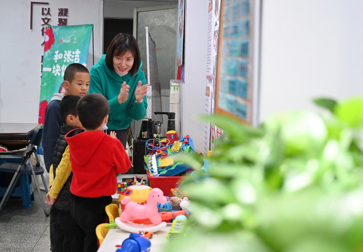 2021年12月4日,张洁(右一)在“村童妈妈聚乐部”教小朋友演唱歌曲《爱的鼓励》。 新华社记者 林善传 摄