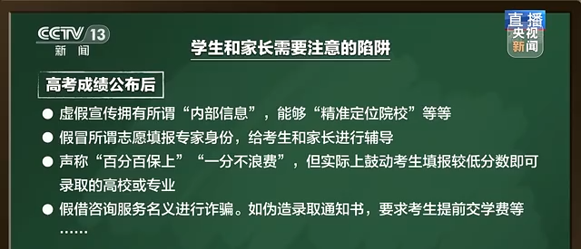 北京大学考试研究院院长秦春华表示,考生和家长在高招阶段面对浩如烟海的高招录取信息,出现心理焦虑的弱点。不法分子利用这个信息不对称的特点,特别是近些年新专业、新领域、新术语等内容与普通民众的生活比较远,骗子甚至有意识制造焦虑,进而让考生和家长陷入陷阱。