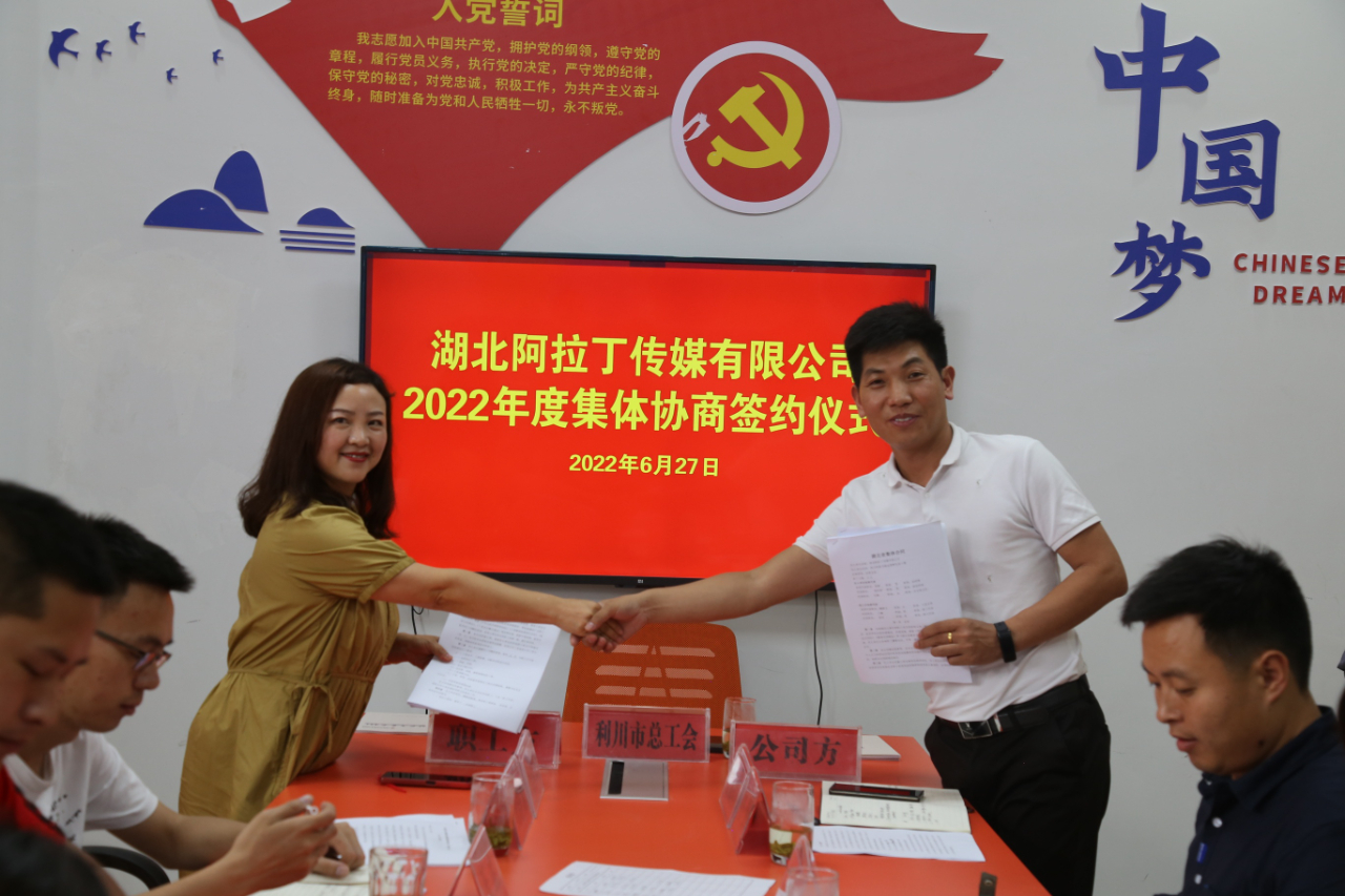 6月27日,湖北省利川市总工会指导湖北阿拉丁传媒有限公司在广泛征求职工意见的基础上,组织召开职工代表大会暨2022年度集体协商会议,劳资双方就最低工资标准和工资发放、社会保险缴纳、团建活动开展等事项进行了协商。