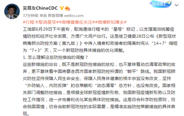 6月30日,中国疾控中心流行病学首席专家吴尊友发布微博解读行程卡取消星号。吴尊友表示,工信部6月29日下午宣布,取消通信行程卡的“星号”标记,以支撑高效统筹疫情防控和经济社会发展、方便广大用户出行。这是继卫健委28日公布《新型冠状病毒肺炎防控方案(第九版)》中将入境者和密接者的隔离时间从“14+7”缩短为“7+3”天,又一个新冠防控具体措施的优化调整。