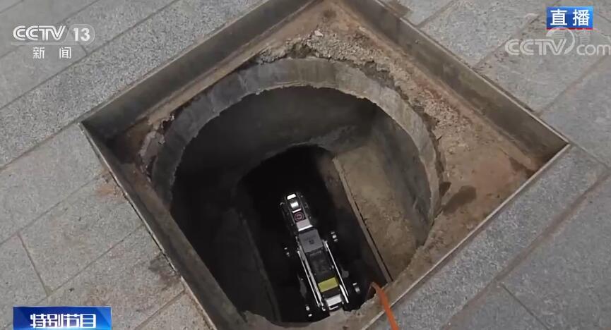 看完了上天的“地信+”黑科技之后,咱们再来看看入地的,在我们的前方有一台地下管道机器人,它准备下去进行管道检修。工人师傅和我们说,有时候地下管道特别细,咱们人是进不去的,而且里边可能会有有毒气体,这个时候它就可以派上用场。地下管道有破损或者是有渗漏,它都能够看得一清二楚,并且把数据实时回传到这台显示器,大家现在在画面上看到的就是它在管道内部的一个操作画面了。它所采集到的地理信息数据也会回传到整个城市的智慧管理平台,像管道长度、管身材质,主管部门都清晰可见,让整座城市的地下毛细血管都可看、可触、可感。