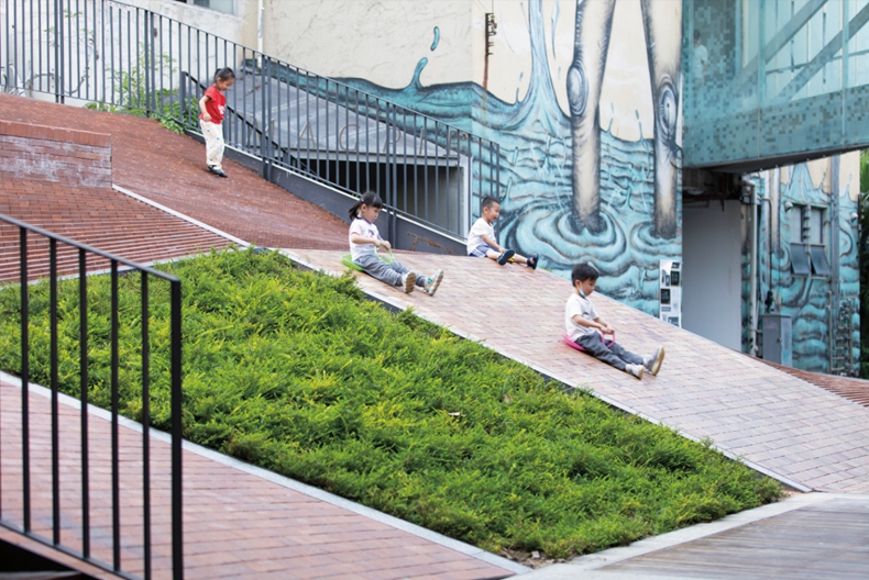 园区大斜坡上,一群孩童在追逐、嬉笑,阳光透过树荫,洒在他们笑脸上。
