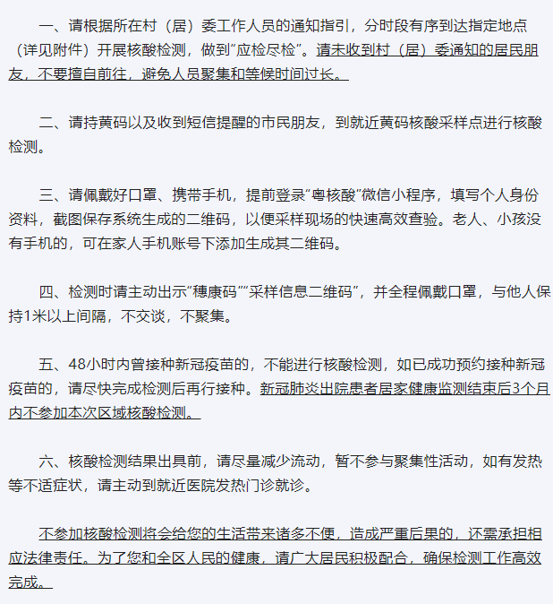 7月2日晚,广州市花都区发布《关于开展疫情防控风险排查工作的通告(第59号)》,通告指出,7月2日,花都区在对重点人员例行核酸筛查中发现1例核酸检测异常人员。根据疫情防控需要,经区新型冠状病毒肺炎疫情防控指挥部研究决定,于2022年7月2日21:30对花东镇域内所有人员开展核酸筛查等风险排查。现将有关事项通告如下: