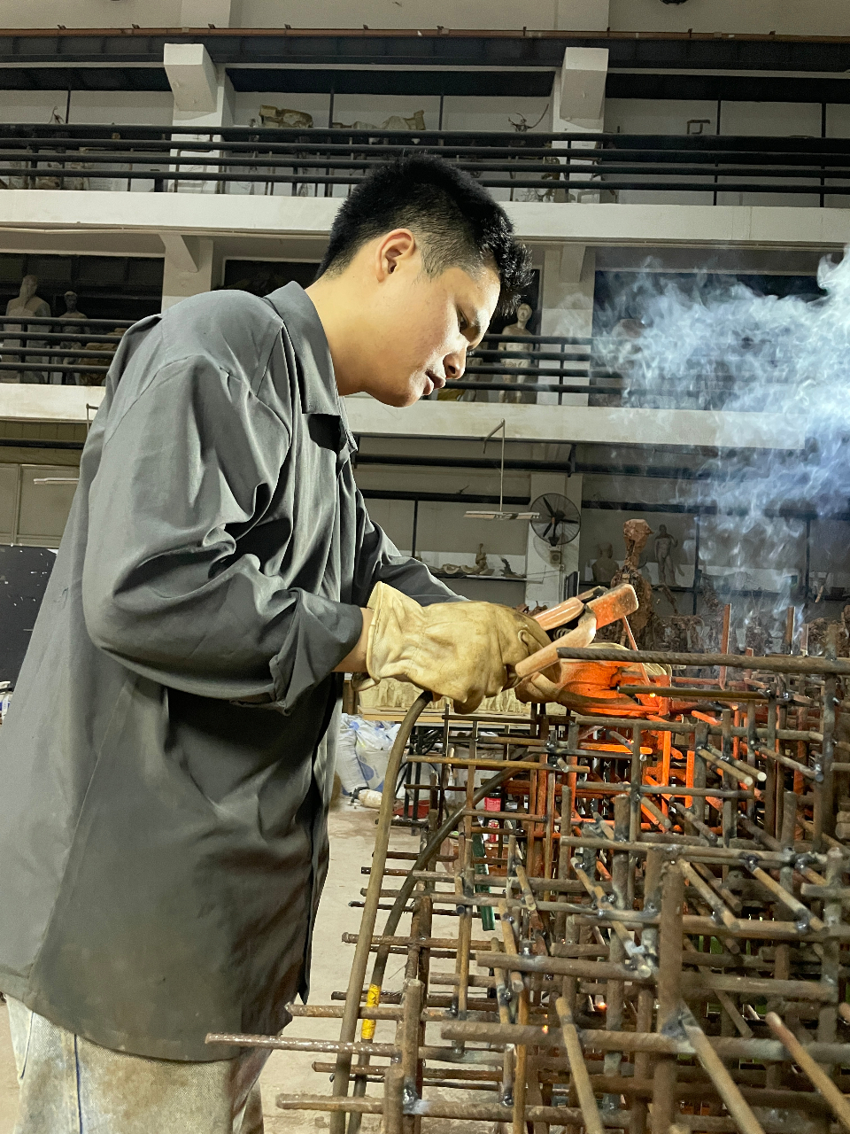 雕塑的过程十分繁琐,需要一点点焊接、一块块拼接……