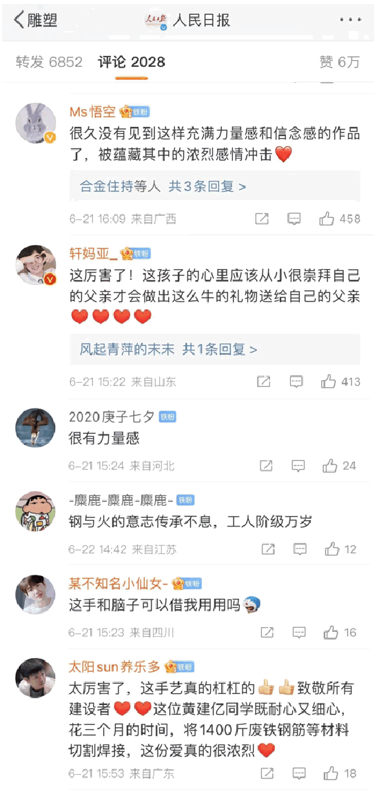 “最有分量的不是钢筋本身,而是对父亲的爱”“工匠精神的全景展示”“艺术该有的样子,给人以震撼”……这个充满力量、写满“沧桑”的作品“戳中”了不少网友的心。