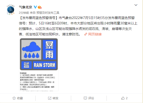 北京市气象台2022年7月5日15时35分发布暴雨蓝色预警信号:预计,5日16时至6日09时,北京市大部分地区将出现小时降雨量30毫米以上的强降水,山区及浅山区可能出现强降水诱发的泥石流、滑坡、崩塌等次生灾害,低洼地区可能出现积水,请注意防范。
