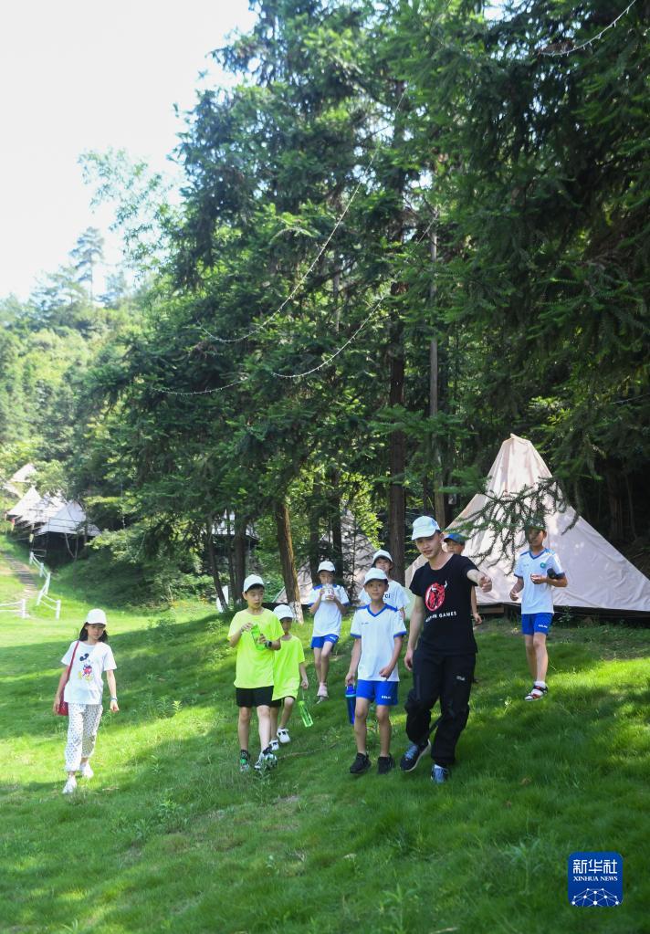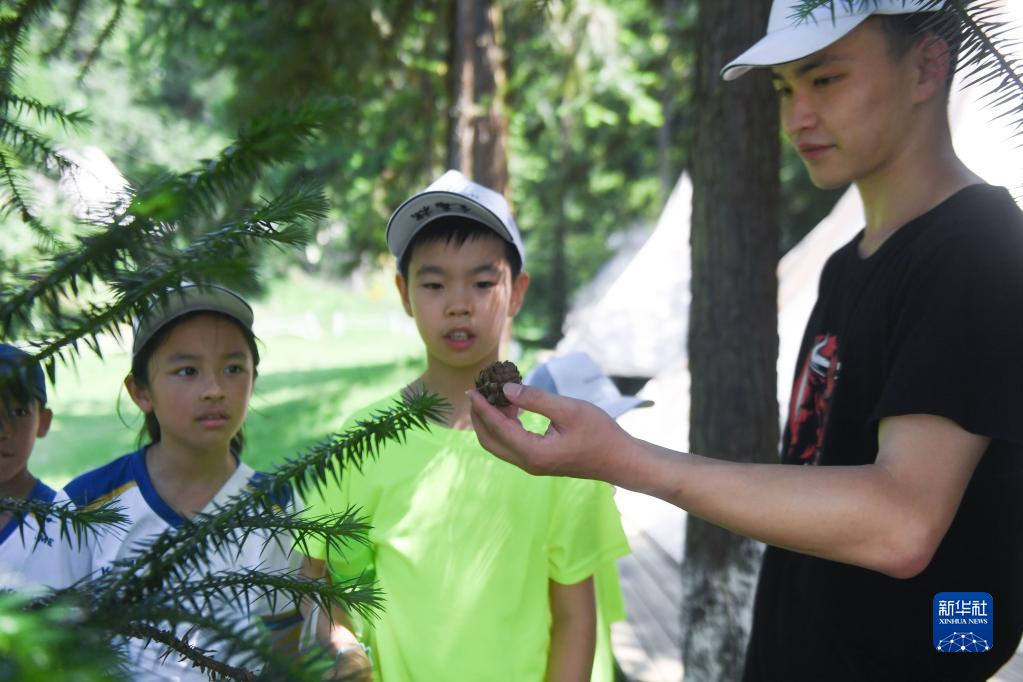 7月5日,在杭州市临安区昌化镇风之谷国际营地,参加夏令营的学生们在老师的带领下了解植物知识。