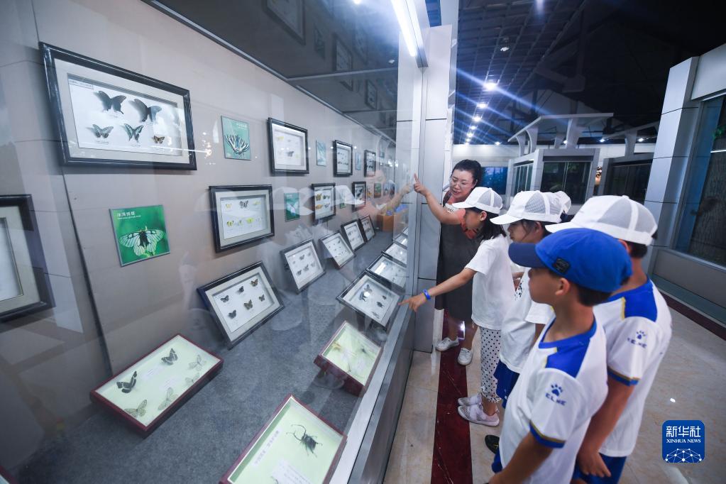 7月5日,参加科普夏令营的学生们在杭州市临安区昌化镇清凉峰科技馆参观,了解动植物知识。