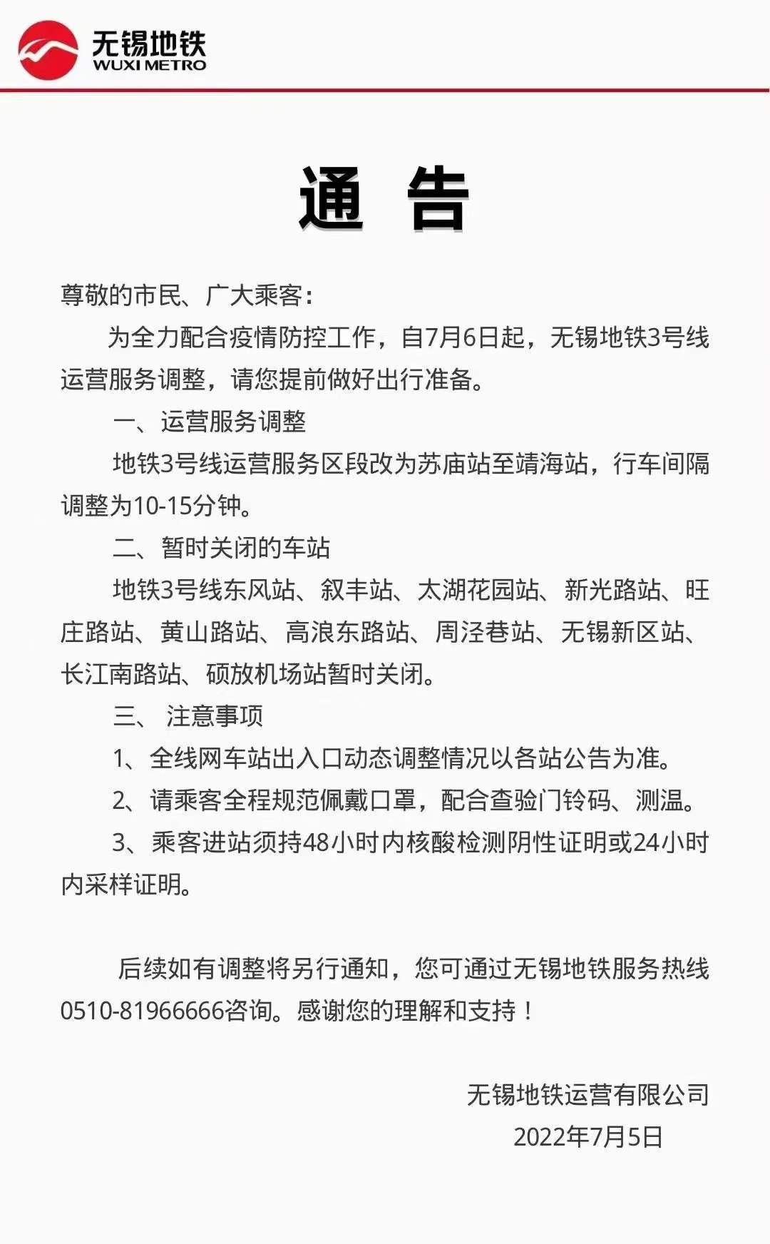地铁3号线东风站、叙丰站、太湖花园站、新光路站、旺庄路站、黄山路站、高浪东路站、周泾巷站、无锡新区站、长江南路站、硕放机场站暂时关闭。