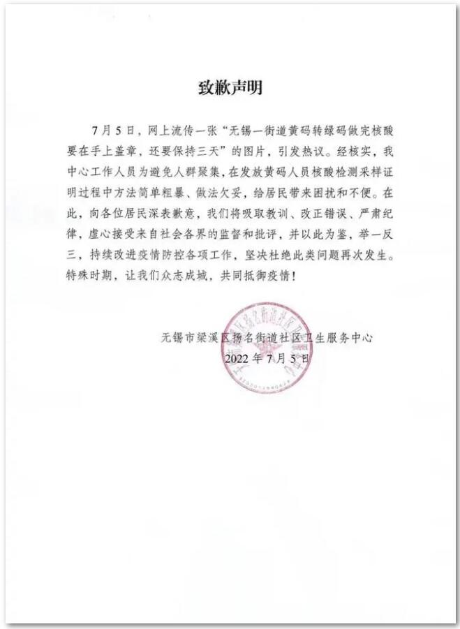 据现代快报消息,扬名街道社区卫生服务中心于5日晚间发布致歉声明,称该做法欠妥,深表歉意。