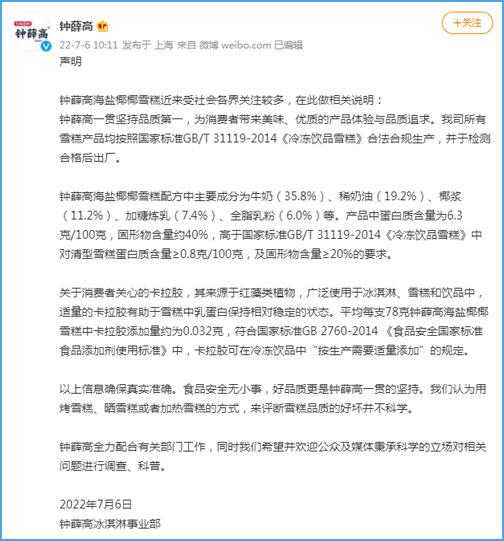 声明还对网友关心的“卡拉胶”问题作出了解释:关于消费者关心的卡拉胶,其来源于红藻类植物,广泛使用于冰淇淋、雪糕和饮品中,适量的卡拉胶有助于雪糕中乳蛋白保持相对稳定的状态。平均每支78克钟薛高海盐椰椰雪糕中卡拉胶添加量约为0.032克,符合国家标准GB 2760-2014 《食品安全国家标准食品添加剂使用标准》中,卡拉胶可在冷冻饮品中“按生产需要适量添加”的规定。