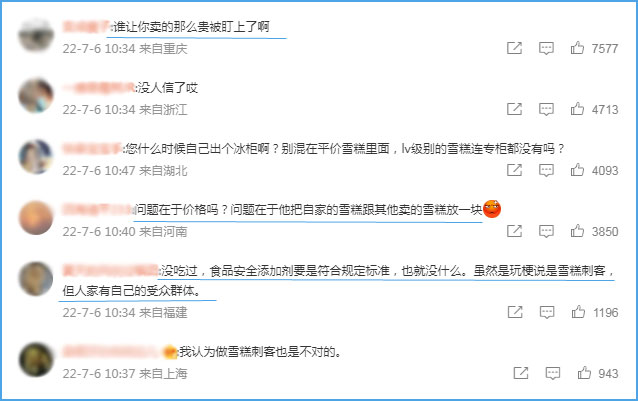 网友在声明后留言态度不一。有网友表示,“谁让你卖的那么贵被盯上了啊”;还有网友回复,“问题在于价格吗?问题在于他把自家的雪糕跟其他卖的雪糕放一块”;也有网友称,“没吃过,食品安全添加剂要是符合规定标准,也就没什么。虽然是玩梗说是雪糕刺客,但人家有自己的受众群体。”