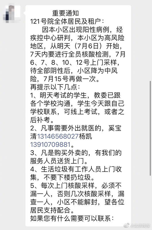 7月6日,位于昌平区东小口镇的中东路121号院发出通知,因小区出现阳性病例,经疾控部门研判,所有居民居家不能外出,小区只进不出。从7月6日起开始,7天内要进行全员核酸检测。