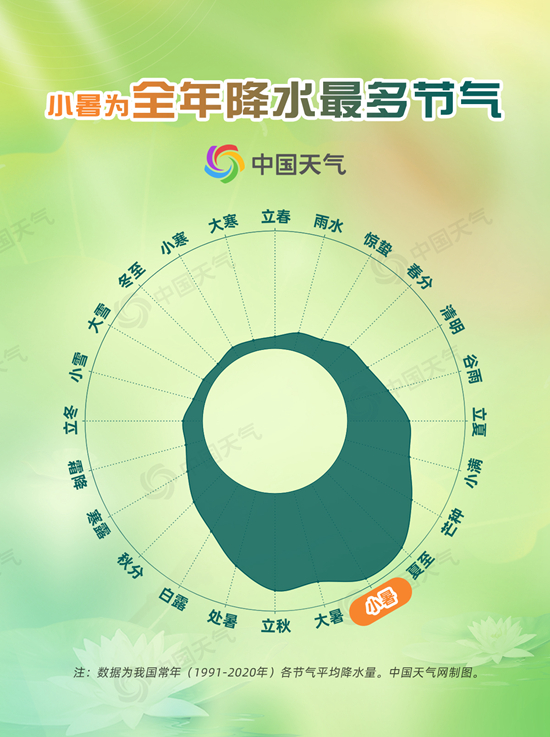统计1991年至2020年气象大数据发现,除了高温,降水在小暑期间也明显增加,鲜明诠释了“雨热同期”的季风气候特点。数据显示,全年来看,夏末秋初为降雨充沛时段,其中,小暑节气最多,平均雨量达到64.7毫米。
