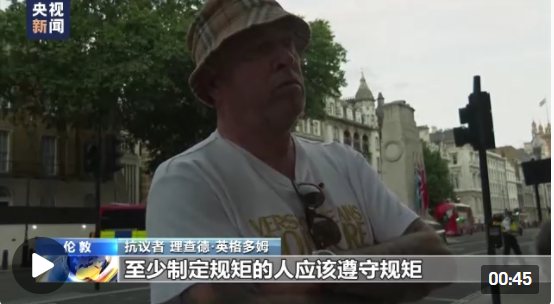 抗议者齐娜·埃弗里特:他(约翰逊)没有处理好“脱欧”,我们不应该选择“脱欧”。我不想当一名抱怨不休的留欧派,但我们的确不应该“脱欧”,(脱欧)导致一片混乱。他没有推行(新冠)疫苗接种,我受够他了。我认为整个糟糕的内阁都应该下台,他给这个国家的政治造成巨大损害,因为政府被他带坏了。