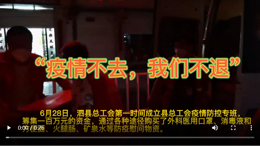 6月26日,安徽泗县,新冠肺炎疫情突然来袭。在这轮疫情中,泗县总工会积极响应县委、县政府发出的“外防输入、内防反弹”总政策和“动态清零”总方针,行动迅速、积极参与,以高度的政治责任感引领全县广大职工积极发挥工人阶级主力军作用,汇聚助力战疫强大力量,彰显了作为职工群众“娘家人”的责任和担当。