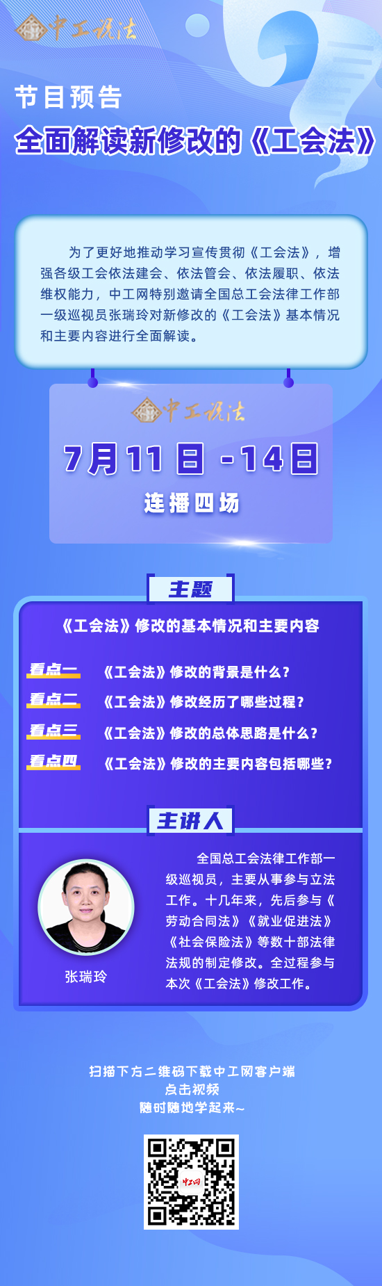 【中工说法】节目预告:7月11日—14日连播四场 全面解读新修改的《工会法》