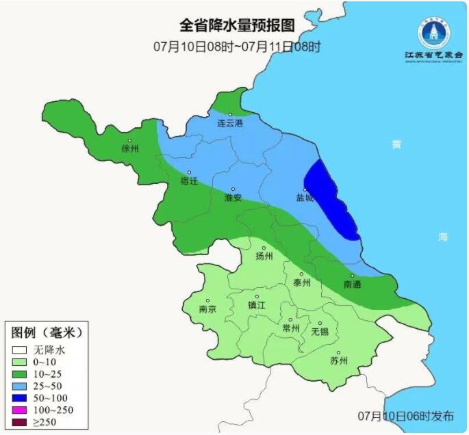 据江苏省气象台消息,7月10日至11日沿江及以北地区有较强降水,沿江和苏南地区伴有高温天气。今天(10日)江淮之间东部和淮北东部地区多云转阴有阵雨或雷雨,雨量中到大,局部暴雨,其他地区多云有分散性阵雨或雷雨,局部雨量大。