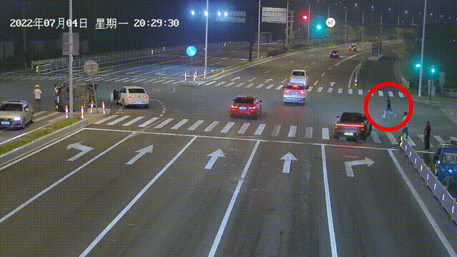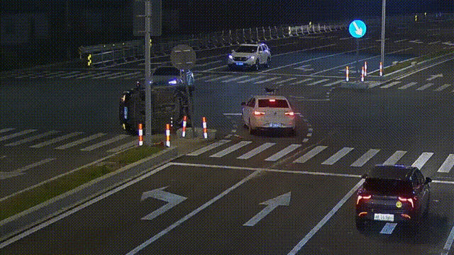 危急时刻,正在对向车道等红灯的白色汽车,果断连续实线变道,停在侧翻车辆边上的车道内。