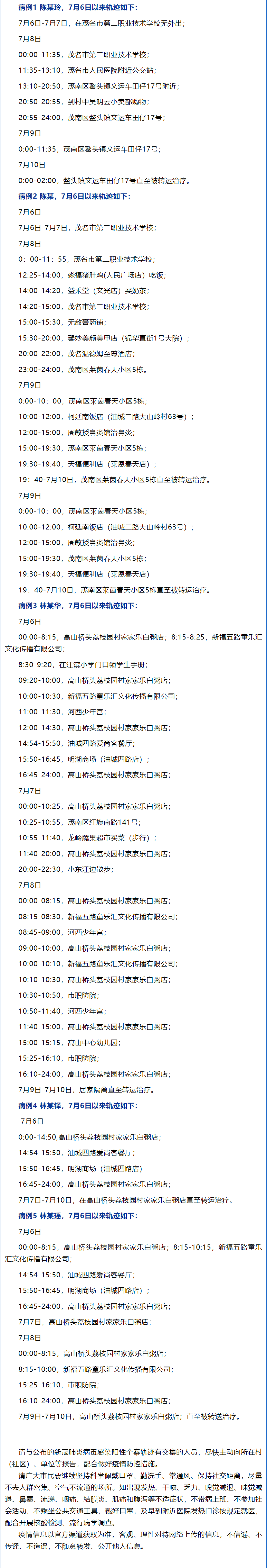 自2022年7月8日广东茂名茂南区报告首例新冠肺炎确诊病例以来,相关确诊病例持续散发,截至7月10日24时,茂南区共报告16例新冠肺炎确诊病例(其中7月8日1例,7月9日10例,7月10日5例)。为做好全民疫情防控,现将7月10日新增的5名确诊病例在茂名市主要行程轨迹公布如下:
