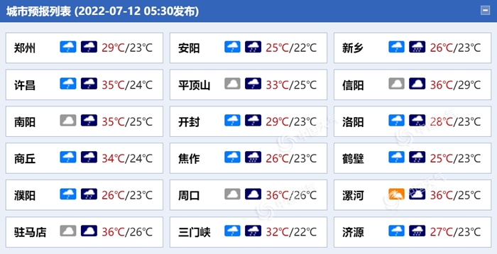 根据预报,今天,河南淮河以北阴天间多云,有分散性阵雨、雷阵雨,其中黄河以北和三门峡、洛阳、郑州北部、开封北部部分县市有中雨,局部大雨或暴雨,并伴有短时强降水、雷暴大风等强对流天气,其他县市多云。最高气温:北部地区27℃~29℃,东部、南部33℃~35℃,其他县市30℃~32℃。